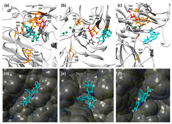 Models of DHP5 interacting with laccases TvLacc (a,d), BacillusLacc (b,e) and Novozym 51003 (c,f). (a–c) The interaction model of DHP5 with the tested laccases. Ligand is coloured in cyan, copper atoms are coloured in green, equatorial T1 copper ligands are coloured in dark grey, an axial copper ligand is coloured in red, binding pocket residues are coloured in orange. (d–f) The surface binding model of DHP5 with the tested laccases.