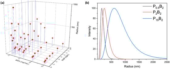 The particle size and distribution of the P4VP-BSA CSNPs was investigated with DLS and TEM. DLS measurements were collected on each of CSNP reactions. Figure 1a shows an overview of the size distribution based on the BSA and P4VP concentrations. The plot shows that the smallest particles, with a radius of 52.3 nm, are obtained when the protein concentration is the highest (15 mg/mL) and the P4VP concentration is the lowest (0.5 mg/mL). The average particle size increases as the P4VP concentration increases and vice versa decreases as the BSA concentration is lowered. This is consistent with previous work which demonstrates that particle size can be controlled as the polymer–protein mass ratio is adjusted [1,12,32]. A table containing the average particle radii can be seen in Table S1. For reactions with the standard 0.24 polymer-to-protein mass ratio, the data shows that particle size decreases as the concentration of both reagents increases. For simplification purposes, reactions will be described using a PXBY format, where “P” represents P4VP, “B” represents BSA, and “X” and “Y” signify their respective concentrations (mg/mL). When comparing the particle size as the concentration of each reagent is adjusted, it becomes evident the amount of protein available in the solution has a much larger effect on particle size than the polymer. For example, for reactions P0.5B15 and P15B15, CSNPs are formed with an average radius of 52.3 and 117.5 nm, respectively. The increase from 0.5 to 15 mg/mL P4VP results in a 224.7% increase in particle size. When comparing to reactions P0.5B1 and P15B1, the average CSNP radius increases from 309.6 to 4107.1 nm, a 1326.6% increase. This increase even more pronounced for reactions of P>2B0.5 where the resulting particle formed reached the upper limit of detection for the DLS instrument and could not be accurately measured. Figure 1b shows the DLS lognormal size distributions for three different CSNP reactions. For the three reactions plotted, P0.5B2, P2B2, and P15B2, an obvious increase in particle distribution is seen as the P4VP concentration is increased. For all BSA-P4VP reactions, an increase in average particle size is also associated with the increase in particle distribution. These results show how the average CSNP size and distribution can be controlled by varying reagent concentration and easily monitored via DLS.