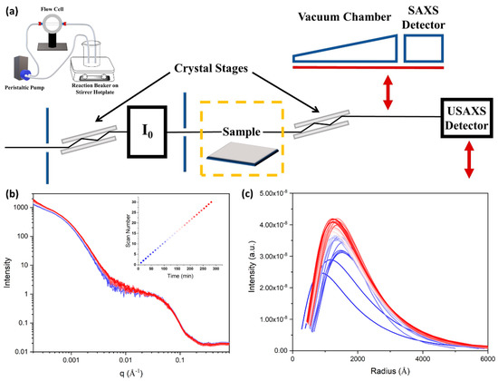 (a) Representation of the in situ experimental setup for the flow cell. The red arrows indicate the vertical motion path of the SAXS vacuum chamber and detectors. Blue vertical lines represent beam slits as part of the beamline optics. Black arrows indicate the two crystal stages used for the Bonse-Hart X-ray optics configuration. (b) Combined USAXS/SAXS CSNP data as a function of time. (c) Lognormal size distribution data from fitting the data in the USAXS range.