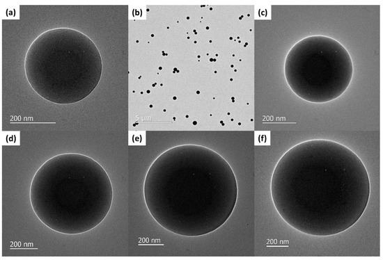 DLS and USAXS provided valuable information related to particle size and distribution of the CSNP systems. To further characterize the CSNPs and analyze particle features such as shape and morphology, TEM images were obtained. Figure 3 shows TEM images from a series of P4VP-BSA reactions. The particles seen in the figure show a gradual increase in diameter as the polymer–protein mass ratio is increased. The TEM measured particle size radius in Figure 3a,c–f are 168, 200, 300, 361, and 440 nm, respectively. The high-magnification images demonstrate the uniform spherical shape and smooth surface. It is worth noting that as particle size increases towards the upper limit, there is no identifiable degeneration of the spherical shape or surface smoothness. Figure 3b also shows a low magnification image of a CSNP reaction. Based on particle size distributions determined via DLS and USAXS data fitting, the range of particle sizes seen in Figure 3b are well within the expected range. The results seen in the TEM images provide useful insight that cannot be obtained by scattering techniques such as DLS and USAXS. These results also help confirm the particle sizes evaluated by these techniques.