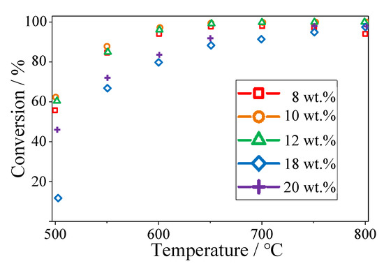 Figure 1 presents the conversion of methane versus temperature on the catalyst with various Ni contents. The results show that the co-microwave synthesized NiO/Sm0.1Ce0.9O1.95 catalyst exhibits high catalytic activity for the oxidation of methane. All catalysts reached a conversion of ~80% above 600 °C. Among them, the SDC catalyst containing 8–12 wt.% Ni gave a higher activity. Examining the effect of temperature on the oxidation activity of CH4, the conversion increased with increasing temperature. Nevertheless, the catalytic activity was more dependent on the content of nickel at low temperatures (<600 °C), while there is not much difference for all catalysts at high temperatures.