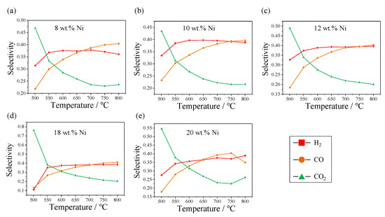The product selectivity versus temperature on the Sm0.1Ce0.9O1.95 catalysts with various Ni contents of (a) 8 wt.%, (b) 10 wt.%, (c) 12 wt.%, (d) 18 wt.%, and (e) 20 wt.% in the gas stream, CH4/O2 (10/5, vol.%), in Ar, at a total flow rate of 30 mL min−1.