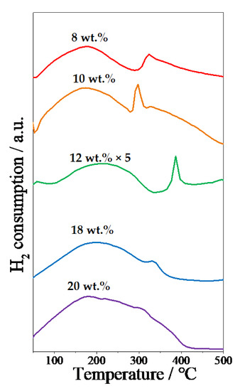Figure 3 shows the temperature-programmed reduction profiles of the SDC catalyst with different nickel contents. The H2-TPR result in the range of 25–500 °C provides information on the supported nickel clusters regarding crystal structure and reduction property because CeO2 is generally characterized by reduction peaks above 500 °C [33]. The TPR profiles show that the catalyst with 8–12 wt.% Ni produces two reduction peaks at low and high temperatures (LT and HT), respectively, while the one with 18–20 wt.% Ni gives only one peak centered at a low temperature ~200 °C. The LT peak was attributed to the reduction of adsorbed oxygen on the SDC and surface NiO sites, whereas the HT resulted from the reduction in internal NiO clusters or the NiO phase interacting with the SDC [7]. The presence of the HT peak was evidence that the reduction in internal NiO sites is a relatively facile process, or that there is a weak interaction between NiO and SDC for a catalyst with low Ni loadings. Specifically, the one with 10 wt. % of Ni displayed the lowest temperature of the HT reduction peak, ~298 °C, implying an easy reduction ability and potentially high activity. On the contrary, the catalyst with high Ni loading tends to cause the agglomeration of nickel species and form large metal crystals (Supplementary Materials Figure S2), which usually take more time and higher temperature for reduction, as shown with a broad H2-TPR profile in Figure 3.