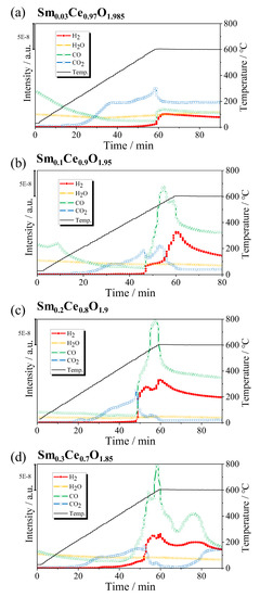 MS profiles of eluting gas products from methane oxidation on the co-microwave synthesized 10 wt.% Ni/SDC catalyst prepared with different Sm/Ce ratios. (a) 0.03/0.97, (b) 1/9, (c) 2/8, and (d) 3/7.