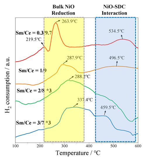 Figure 5 compares H2-TPR profiles of the Ni/SDC catalyst with different Sm/Ce ratios. The H2-TPR results show that three kinds of reduction zone (labeled as α, β, and γ) can be observed. The low-temperature zone (α) resulted from the reduction in adsorbed oxygen in SDC oxygen vacancies. The α zone merged into zone (β) around 288 °C as the Sm/Ce ratio increased. The γ zone, a right shoulder of β peak extending to high temperature, was attributed to the reduction in surface NiO sites and those weakly interacting with the SDC [7,34]. The shoulder γ peak was shaved down with an increasing Sm/Ce ratio. Higher contents of Sm in the CeO2 raised the reduction temperature of NiO, while the interaction between NiO and SDC is weakened. By contrast, low doping of Sm in the CeO2 decreased the reduction temperature of NiO, whereas the interaction between NiO and SDC remained intense. The catalyst exhibiting optimum interaction between NiO and CeO2 was determined to be the one with an Sm/Ce ratio = 2/8.