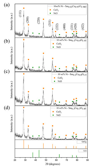 The XRD patterns of the synthesized Ni/SDC catalyst with different Sm/Ce ratios, (a) 0.03/0.97, (b) 1/9, (c) 2/8, and (d) 3/7.