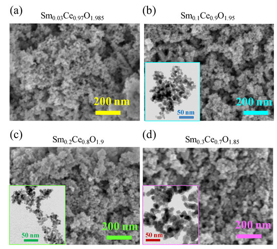 The crystal particle size and morphology of the as-synthesized samples were analyzed by scanning and transmission electron microscopy (SEM and TEM), as shown in Figure 7. It was clearly seen from the images that the particles on all catalysts were very small crystallites below 20 nm, while some crystallites aggregated together. The particle size became larger with an increasing Sm/Ce ratio, as examined carefully by TEM (shown in the inset of Figure 7). The relationship of particle size versus Sm/Ce ratio agreed well with that of the XRD analysis. Nevertheless, it is challenging to distinguish NiO from SDC, since there is a uniform distribution of particles and crystal phases. The analysis of XRD and EM results both suggested that the NiO species were in nanoscale below 5 nm or partly non-crystalline. These results need to be examined further by high-resolution TEM.