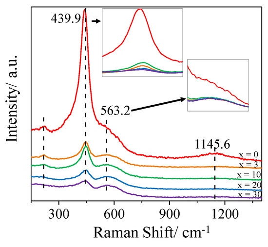 Raman Spectra of the as-synthesized 10 wt.% Ni/SmxCe1−xO2−δ catalyst.