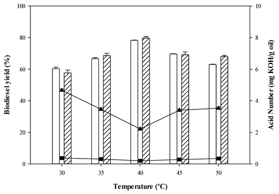 Both CPO and RPO biodiesel yields illustrate a significant increase from 30 °C to 40 °C (See Figure 1). A higher reaction temperature could shift the equilibrium to the right-hand side, leading to higher conversion rate because the fast mobility of the reactants led to a greater number of collisions between the reactants than occurs at lower reaction temperatures. This is in agreement with a previous study [43]. On the other hand, biodiesel yields were reduced as reaction temperatures became higher than 40 °C, due to enzyme denaturation at higher temperatures. Similar results were explained by Jambulingam et al. 2019 who studied the effect of temperature on the esterase activity of immobilized lipase and observed that the maximum esterase activity occurred at a temperature of 45 °C. In this study the highest biodiesel yields from CPO (79.67%) and RPO (74.23%) and the lowest FFA content from CPO (2.21 mg KOH/g oil) and RPO (0.20 mg KOH/g oil) were obtained at 40 °C. Therefore, the temperature at 40 °C was further used in subsequent experiments. Similar results were also reported by Tan et al. [44]. Esterification of FFAs in hydrolyzed palm oil using Candida sp. 99–125 lipase as biocatalyst (15 wt%. enzyme loading) led to the highest biodiesel yield (95%) at 40 °C at a total reaction time of 30 h. Previously, biodiesel production from FFAs of CPO via the esterification reaction in the presence of isooctane catalyzed by a commercial enzyme, Novozyme 435, was reported by Talukder et al. [45], with the maximum biodiesel yield (98%) obtained at 40 °C.
