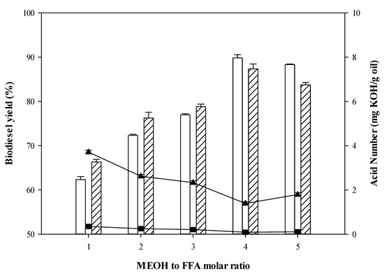 The MEOH to FFA ratio was investigated. It was found that biodiesel yields of CPO/RPO continually increased between ratios of 1:1 and 4:1 as shown in Figure 2. Based on stoichiometry, the reaction required one mole of both FFAs and methanol generated FAMEs. As esterification is a reversible reaction, a higher MEOH to FFAs ratio more than 1:1 could drive esterification forward. However, a reduction of biodiesel yield was observed when the ratio used exceeded 4:1. The maximum biodiesel yields of FFAs from CPO (87.36%) and RPO (89.84%) together with the minimum FFAs content of CPO (1.39 mg KOH/g oil) and RPO (0.09 mg KOH/g oil) were reached at a ratio of 4:1. Thus, the ratio of methanol to fatty acid of 4:1 was deemed to be the best ratio for biodiesel production from CPO/RPO. Likewise, in earlier literature [44] which studied biodiesel production from FFAs in hydrolyzed palm oil via esterification catalyzed by Candida sp.99-125 lipase (15 wt%. enzyme loading). They also found that the highest biodiesel yield (90%) was also obtained when the ratio of MEOH to FFA ratio was at 3:1 with methanol being added twice at different stages of the biodiesel production process. Furthermore, Kareem et al. [46] also reported that the optimal MEOH to FFA ratio for enzymatic biodiesel production from palm oil and palm kernel oil using 5 wt%. enzyme loading was 3:1. Maximum biodiesel yields from palm oil (95%) and palm kernel oil (82.5%) were observed at this molar ratio.