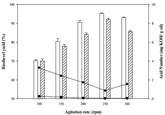 Third, the influence of agitation speed on biodiesel production was investigated. Both CPO and RPO biodiesel yields presented an upward trend as agitation speed increased from 100 rpm to 250 rpm (See Figure 3). Seemingly, a high agitation speed can promote high efficiency mass transfer of the liquid phases (CPO/RPO and methanol) and also maintain homogeneity leading to effective conversion of reactants in high biodiesel yields [47]. The biodiesel yield was remarkably reduced at agitation speed of 300 rpm, perhaps due to insufficient interaction time between the reactants [43]. The highest biodiesel yields of CPO (92.14%) and RPO (95.28%) and the lowest FFAs content of CPO (0.87 mg KOH/g oil)/RPO (0.25 mg KOH/g oil) were achieved at 250 rpm. Therefore, an agitation speed of 250 rpm was chosen as a suitable agitation speed for esterification of FFAs from CPO/RPO. Similarly, the influence of agitation speed on enzymatic esterification of FFAs in hydrolyzed CPO in the presence of isooctane was previously investigated by Talukder et al. [45]. Their results also revealed that an agitation speed of 250 rpm was the best condition for biodiesel production.