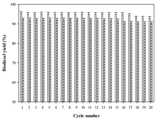 The reusability and stability of immobilized alginate-PVA lipase beads in esterification of FFAs obtained from CPO/RPO were carried out under the optimal conditions (40 °C, 4:1 MEOH to FFA ratio and 250 rpm agitation speed for 20 cycles. Remarkably, the immobilized lipase beads gave high biodiesel yields of CPO (92.14%) and RPO (95.28%). It should be noted that the biocatalyst provided high catalytic efficiency as well as high reusability for CPO (16 cycles) and RPO (17 cycles) as shown in Figure 4. Lower catalytic efficiency of biocatalyst was observed after eighteen cycles onwards because lipase lost its stability in methanol. Furthermore, enzyme leakage from the immobilized beads could occur with a high cycle number [48]. Both the CPO and RPO biodiesel yields obtained were in agreement with other works [49,50,51,52,53]. However, considered in terms of reusability and stability, immobilized alginate-PVA lipase R. oryzae illustrated higher stability than other biocatalysts when comparing to previous works (See Table 3). Furthermore, the reusability of biocatalyst obtained agreed with other previous works. The immobilized alginate-PVA lipase bead could be reused for over 10–15 cycles with high catalytic efficiency for biodiesel production [14,32]. Therefore, it can be stated that an alternative cleaner process for biodiesel production from CPO/RPO could also enhance catalytic efficiency and stability of immobilized lipase.