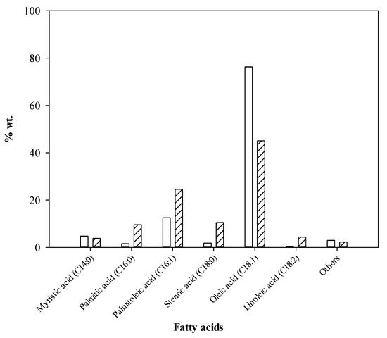 FFA content in both CPO and RPO was determined and the results are presented in Table 1. It was revealed that the CPO was mainly composed of oleic acid, palmitoleic acid, stearic acid, and palmitic acid, respectively. Meanwhile, in the case of RPO, the main fatty acids present were oleic acid and palmitoleic acid.