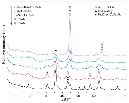 From XPS results (Figure 5) of reduced samples, both FCCA-N and FCCA-K give signals at electron-binding energies of about 932.5 eV, 780.2 eV and 711.2 eV, assigned to Cu 2p3/2, Co 2p3/2 and Fe 2p3/2 [18,30], respectively. Na modification gives rise to a slight decrease in all electron-binding energies of FCCA-K, and K modification leads to an obvious decrease in those of FCCA-N. The simultaneous introduction of K-Na exhibits the biggest shift to a low binding energy value. This is possibly because the introduced alkali metal ions exist in the form of oxides, which can provide more electrons for Fe@Cu or Fe-Co@Cu alloy phase [18,20]. Meanwhile, K ions have a bigger ionic radius than Na, and the corresponding oxides have a stronger capacity to provide electrons [30]. All this evidence indicates that the introduced alkali ions promote the formation of electron-rich metallic active phases in the following order: Na < K < K-Na. This shows that the simultaneous modification of alkali metals K and Na gives a synergistic effect of increasing the electron-rich property of active phase metallic Fe@Cu and Fe-Co@Cu crystals.