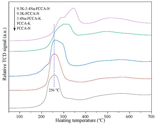 As shown in H2-TPR profiles of FeCoCuAl catalysts (Figure 2), both FCCA-N and FCCA-K exhibit a sharp reduction peak at about 256 °C, which is perhaps from H2 consumption due to the reduction of Cu2+ → Cu0 [31], Fe3+ → Fe2+ [32] and Co3+ → Co2+ [33]. Additionally, these reduced Fe and Co species are highly dispersed due to ready occurrence of their reduction only at a low temperature. When the Na promoter is introduced into FCCA-K, this reduction peak becomes broad and slightly shifts to a high temperature. This is mainly because the presence of Na ions promotes the reduction of iron and cobalt oxides to a metallic state. Moreover, the modification of K and K-Na can further make the reduction peak broader and shift to a higher temperature. Additionally, the simultaneous introduction of K and Na brings forth a new broad reduction peak near 500 °C, which is possibly from the reduction of iron and cobalt species in CoFe2O4. These results indicate that Na and K modification is beneficial to the easy reduction of Fe2+ and Co2+, forming metallic Fe and Fe-Co alloy, which can be further proved by H2-TPR profiles of FeCoCuAl catalysts with different K and/or Na amount (see Figures S4–S6 in Supplementary Materials). The improvement order is Na < K < K-Na modification. From H2-TPR results, it can be proved that Cu0 crystal core should be produced first, and followed by the formation of Fe@Cu and Fe-Co@Cu crystals during reduction by H2, in agreement with the above XRD results.
