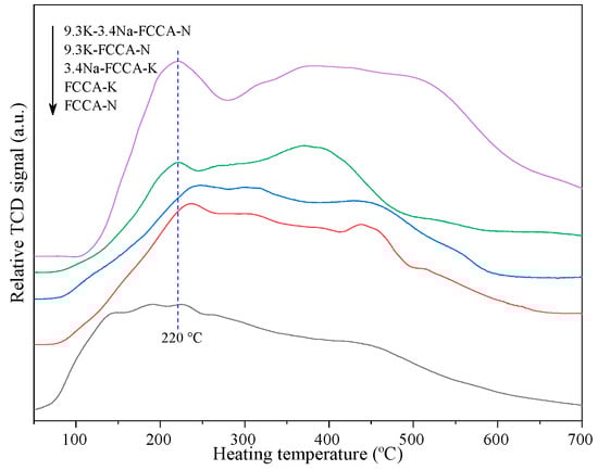 H2-TPD curves of all reduced FeCoCuAl catalysts are shown in Figure 3. FCCA-N without K modification exhibits a broad H2 desorption peak in a temperature range of 110–300 °C, which can be assigned to the desorption of H2 species bonded with O atoms of iron oxide and CoFe2O4 species exposed on the catalyst surface [34]. However, FCCA-K without Na modification exhibits a wide H2 desorption band in a higher temperature range of 200–470 °C. This is perhaps because FeCoCuAl synthesized by using a Na alkali solution as a precipitant contains more highly dispersed iron and cobalt oxides on the catalyst surface. When K alkali solution is used as a precipitant, the synthesized FeCoCuAl oxides are dense particles with a small surface area and pore diameter (see Table 1). This is perhaps due to the formation of Fe3O4-CoFe2O4 solid solution [29]. The ferric and cobalt oxide species in solid solution provide fewer surface O atoms. H2 adsorption mainly occurs on the surface of metallic Cu0 and metallic oxide solid solution, which is difficult to reduce. Additionally, FCCA-N modified with K as a promoter exhibits a similar H2 desorption behavior to FCCA-K. These results indicate that the obtained FeCoCuAl catalysts, whether with K modification or using K alkali as a precipitant, contain more CoFe2O4 or Fe3O4-CoFe2O4 solid solution. Na-modified FCCA-K exhibits two obvious H2 desorption peaks at 220 °C and near 400 °C, respectively. The similar results are also observed from H2-TPD results of FeCoCuAl catalysts with different K and/or Na amount (see Figures S7–S9 in Supplementary Materials). Additionally, these two peaks become more distinct for FCCA-N simultaneously modified by Na and K as promoters. In any case, both XRD and H2-TPR results have proved that Na and/or K modification leads to the easy formation of metallic Fe@Cu or Fe-Co@Cu alloy in FeCoCuAl catalysts, because alkali Na+ and K+ ions can provide an electron-rich environment [35]. Therefore, the obvious and broad H2 adsorption peak bands in a temperature range of 200–420 °C are attributed to the desorption of active H formed by dissociative adsorption on metallic Fe@Cu or Fe-Co@Cu alloy species. Combined with XRD results, it can be deduced that Fe@Cu (110) or Fe-Co@Cu alloy (200) perhaps provides the main sites for H2 dissociative adsorption.