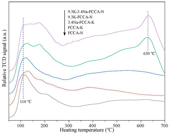 CO2-TPD results (Figure 4) indicate that all reduced FeCoCuAl catalysts exhibit a CO2 desorption peak at 110 °C, which is attributed to weakly adsorbed CO2. Meanwhile, it can be observed that Na-modified FCCA-K shows a new and weak CO2 desorption band at 350–600 °C, along with a slight shift to a low temperature. This shows that the introduced sodium promoter can provide more base sites. K- and K-Na-promoted samples exhibit two obvious new CO2 desorption peaks at about 180 °C and 630 °C, respectively. The similar results are also observed from CO2-TPD results of FeCoCuAl catalysts with different K and/or Na amount (see Figures S10–S12 in Supplementary Materials). The former is attributed to CO2 weakly adsorbed on moderate base sites. Additionally, the latter should be from the decomposition of bidentate carbonate species produced by the strong interaction between CO2 and potassium or sodium ferrite (K2Fe2O4 or Na2Fe2O4) with strong base sites [19]. This is because the alkali K+ possesses a stronger alkalinity than Na+. For the same reason, the introduction of alkali metal ions can lead to the formation of electron-rich Fe@Cu and Fe-Co@Cu alloy crystals, which can also activate CO2 molecules. All these data show that simultaneous promotion of K and Na exhibits a synergistic effect when activating H2 and CO2.