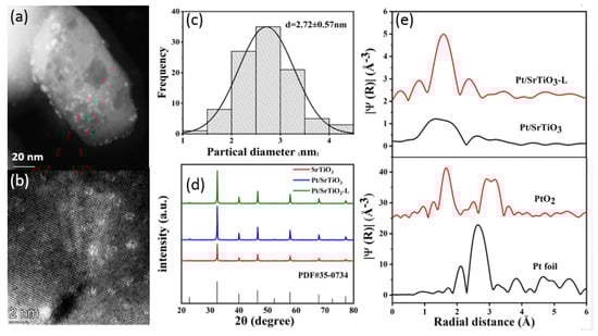 STEM photos of (a) Pt/SrTiO3 and (b) Pt/SrTiO3-L, (c) size distribution of Pt particles on Pt/SrTiO3 and (d) XRD profiles of catalysts, (e) Fourier transform of extended X-ray absorption fine structure (EXAFS) spectra of Pt L3 edge for Pt/SrTiO3 and Pt/SrTiO3-L catalysts.