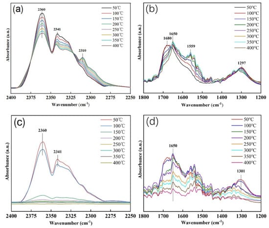 Figure 4a,b shows the in situ FTIR of CO2 and the H2 co-adsorption on SrTiO3. The peaks at 2400–2300 cm−1 are assigned to the linear adsorption of CO2 [2,18,25]. The peaks at 1650–1680 cm−1 and 1300cm−1 are assigned to asymmetric and symmetric stretching of , respectively [18]. All of the species desorb with the elevation in the temperature. At temperatures higher than 200 °C, CO2 molecules mainly physically and weakly adsorb on the SrTiO3 support. The formate species (1559 cm−1) on SrTiO3 can only be found at temperatures higher than 150 °C, indicating that SrTiO3 also participates in the formation of formate intermediates.