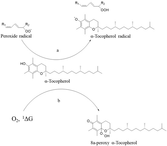 Vitamin E is easily oxidized and is unstable to light and singlet oxygen. The antioxidant property of VE is reflected either in its termination of the free radical chain reaction (Figure 1a), or in the way that itself can be oxidized and lose its antioxidant property (Figure 1b). Herein, when vitamin E is extracted from natural sources or is synthesized by chemical methods, it easily loses its original antioxidant function when added to products due to its own oxidation during the process of production, transportation, and storage. Therefore, the modification on vitamin E to improve its stability is significant in promoting its wider application [5].