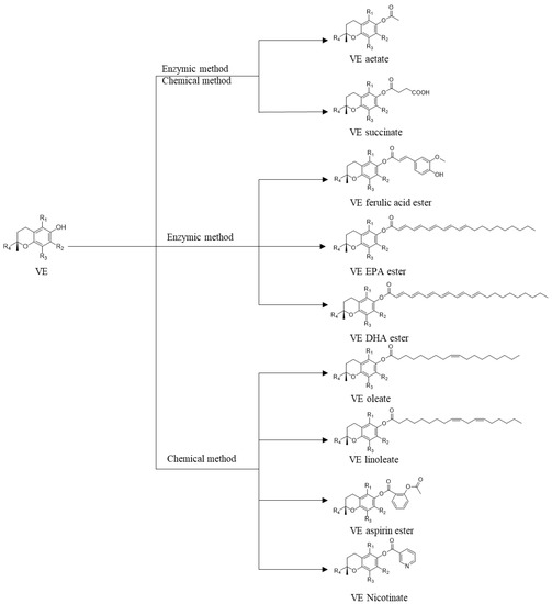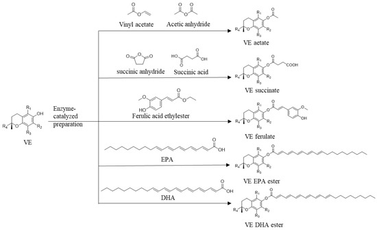 Lipase-mediated synthesis of vitamin E acetate, vitamin E succinate, vitamin E DHA/EPA ester, and vitamin E ferulic acid ester are widely studied (Figure 3).