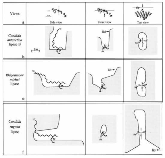 Trigrams of lipase active sites in CRLB, RML and CRL [34]. Reprinted from Chemistry and Physics of Lipids, Vol. 93, Jürgen Pleiss, Markus Fischer, Rolf D Schmid, Anatomy of lipase binding sites: the scissile fatty acid binding site, Pages No. 67–80, Copyright 1998, with permission from Elsevier.
