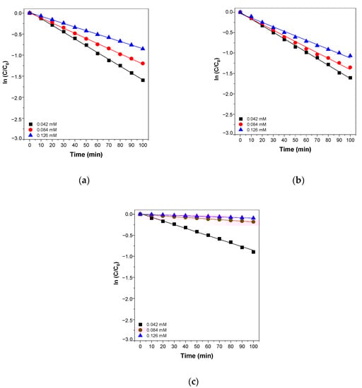 2.5. Effect of Initial Dye Concentration on the Photocatalytic Degradation of Azo Dyes
