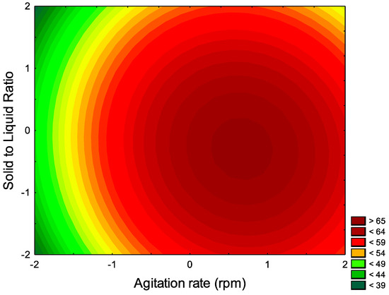 The effects of the variables are presented in Table 2. All linear parameters were statistically significant. The amount of enzyme and the agitation rate presented positive effects while the incubation time and solid-to-liquid ratio presented negative effects. The positive effect of the agitation rate on the oil extraction yield in AEE was the highest among the linear effects. It can be attributed to the fact that this variable is important to maintain a homogeneous reaction medium, a multiphasic system (solid, aqueous, and oily phases), avoiding concentration gradients, and thus enabling the release of the oil [64]. In the case of the amount of enzyme, its positive effect can be attributed to the fact that as the amount of enzyme molecules increases, there will be more interactions with the substrate, that is, greater destruction of the cell wall, and consequently, greater oil release [60,83]. Regarding to the solid-to-liquid ratio, this parameter plays an important role in the maintenance of an adequate homogeneity, viscosity, and concentration of the reaction medium that favors the interaction between the enzyme and the seed particles; however, an excessive volume of water would lower the concentration of substrate and enzyme, reducing the effectiveness of the enzyme treatment, and brought difficulties in the subsequent downstream processing, generating a negative influence on oil extraction [70,84]—as can be observed in this study. With respect to incubation time, it presented a negative effect, which means that by increasing incubation time, the extraction yield was decreased. This result could be considered unexpected, since it is expected to find that the longer the incubation time is, the greater the degradation of the components of the seed cell wall, and therefore, the higher the oil extraction yield. However, it has been described that an excessive incubation time can promote the formation of increasingly thick and stable oil in water emulsions, generated by the emulsifying activity of some peptides and polysaccharides that are released during the destruction of the cell wall, reducing the final extraction of the oil [65,85].