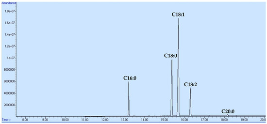 Fatty acid compositions of the AEE- and SE-extracted OMSS are shown in Table 4. As can be observed, three saturated fatty acids (SFAs), one monounsaturated fatty acid (MUFA) and one polyunsaturated fatty acid (PUFA) were identified as the main components, and there were no statistically significant differences in the percentages of these fatty acids obtained for the two evaluated extraction methods (with the exception of linoleic acid, which presented a very slight difference, which cannot be considered relevant for the quality of the oil) [64]. As can be seen in Figure 2 and Table 4, the SFAs were palmitic acid C16:0 (8.7–9.6%), stearic acid C18:0 (27.8–28.1%), and arachidic acid C20:0 (0.8%). On the other hand, the MUFA oleic acid C18:1 (49.6–50.5%) was the most predominant fatty acid presented in OMSS, while the main PUFA was linoleic acid C18:2 (11–13%). A similar composition with small differences was reported for OMSS by Hernández-Santos et al. (2017), Moo-Huchin et al. (2013), and by Solís-Fuentes et al. (2015). These last ones found palmitic (10.50 ± 2.63%), stearic (28.65 ± 1.82%), oleic (48.62 ± 1.95%), linoleic (10.77 ± 0.01%), linolenic (0.58 ± 0.21%), arachidic (0.36 ± 0.19%), and behenic (0.40 ± 04%) acids. The differences found in the composition of fatty acids between the aforementioned work and this study can be attributed to the mamey variety, harvesting, fruit maturity, and the geographical location (which may affect the soil, climatic conditions) [72,90]. All these parameters may affect the lipid profile in OMSS [15]. As reported by Hernández-Santos et al. (2017), the fatty acid composition found in OMSS is similar in its main fatty acids, to those found in some edible oils such as soybean and olive oil, having in common with these oils a high content of oleic acid, which is desirable for oil stability during the frying process, and mainly in terms of nutrition, because it has been demonstrated that oleic acid consumption reduces coronary heart disease risk, mainly via LDL-cholesterol reduction, and has beneficial effects on risk factors for cardiovascular diseases (such in vitro LDL oxidative susceptibility, thrombogenesis, and insulin sensitivity) [91]. High oleic acid content places this oil in the category of high oleic oils, making it able to compete with highly demanded commercial edible vegetable oils [18,20].