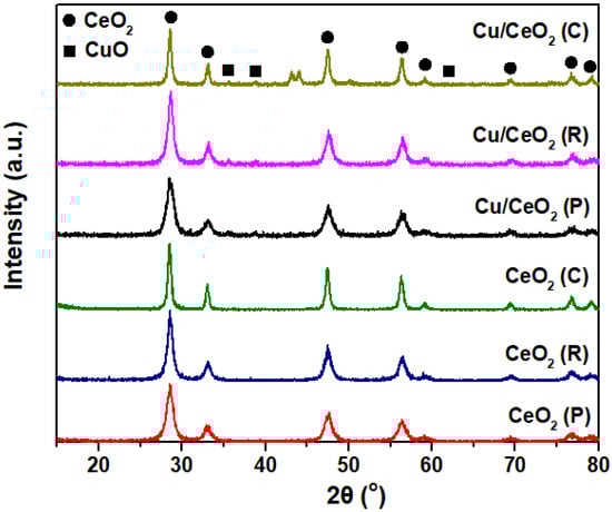 The structural and textural properties of the samples are summarized in Table 1. Bare ceria materials exhibit larger BET surface areas, as compared to the mixed ones, following the order: CeO2 (P) (109 m2/g) > CeO2 (R) (92 m2/g) > CeO2 (C) (40 m2/g). Incorporating copper into ceria supports (through impregnation and subsequent calcination) reduces the BET surface area in all samples, with nanopolyhedra still exhibiting the highest value. Specifically, the copper–ceria samples demonstrate the following sequence in relation to surface area: Cu/CeO2 (P) (91 m2/g) > Cu/CeO2 (R) (75 m2/g) > Cu/CeO2 (C) (34 m2/g).