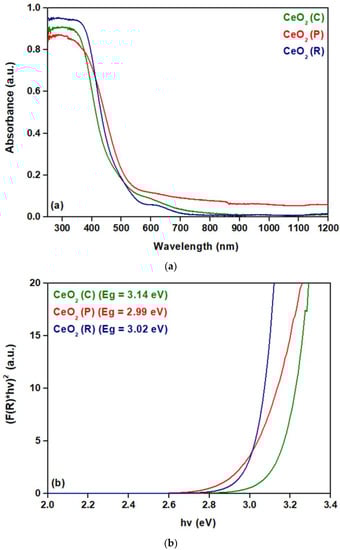 (a) Absorbance spectra and (b) (F(R)*hv)2 diagram as a function of photon energy based on Kubelka-Munk model for ceria samples of different morphology (nanocubes (C), nanopolyhedra (P), nanorods (R)).