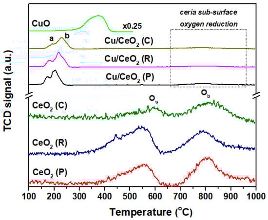 The morphological effects of CeO2 on reducibility were explored by TPR experiments, using H2 as reducing gas. The reduction profiles of pure CeO2 and CuOx/CeO2 samples are shown in Figure 5. The quantitative results, in terms of H2 consumption (mmol H2/g) and TPR peak temperature, are summarized in Table 2. Pure ceria exhibits two broad peaks at ca. 550 °C (Os) and 800 °C (Ob), corresponding to the reduction of surface and bulk oxygen, respectively [39,40]. The reduction profile of bare CuO, included for comparison purposes, exhibits one reduction peak at 380–390 °C.