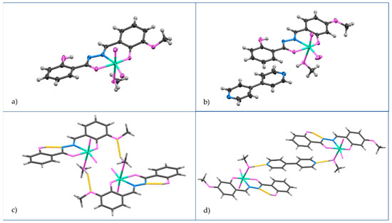 Molecular structure of (a) complex [MoO2(L3OMe)(MeOH)] and (b) complex co-crystal [MoO2(L4OMe)(MeOH)]·4,4-bpy. Carbon atoms are colored dark gray, hydrogen atoms light gray, oxygen atoms pink, nitrogen atoms blue, and molybdenum atoms turquoise. Molecules are connected via hydrogen bonds into supramolecular dimers. In the case of (c) [MoO2(L3OMe)(MeOH)] hydrogen bonds are realized through methanol-methoxy group interaction, while in (d) [MoO2(L4OMe)(MeOH)]·4,4-bpy they are realized through methanol–bipyridine interaction.