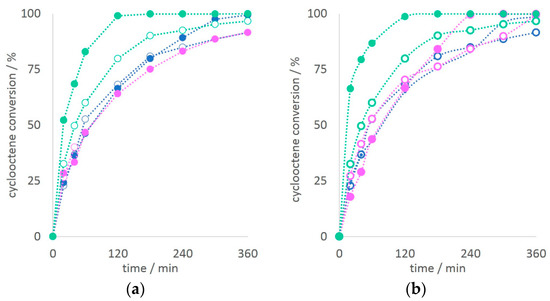 Kinetic profiles of cyclooctene conversion with (a) oligomeric catalysts and (b) monomeric catalysts. The colored sphere presents the reaction with TBHP in decane and the empty circle presents the reaction with THBP in water. Blue circles are complexes obtained from H2LH ligand, green complexes obtained from H2L3OMe ligand, and pink complexes obtained from H2L4OMe ligand.