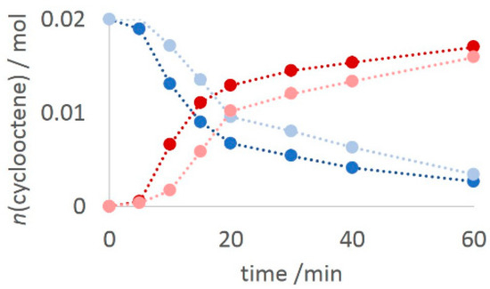 Cyclooctene conversion (falling curves) and corresponding epoxide formation (rising curve) for the first 60 min of the reaction. Dark red and dark blue curves present the reaction with the catalyst [MoO2(L3OMe)(MeOH)], while pale red and pale blue curves present the reaction with the catalyst [MoO2(L3OMe)]n.