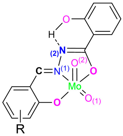 Oligomeric complexes [MoO2L]n were easily distinguished from monomeric by the simple comparison of the IR-ATR spectra. The wide absorption band at around 810 cm−1, attributed to Mo=O…Mo polymerization mode, vanished in the spectra of the corresponding monomeric complex [MoO2L(MeOH)] [14,15]. The appearance of the stretching frequencies characteristic of ν(MoO2) (found at 940 cm−1, 917 cm−1 and 900 cm−1) characterized unambiguously the monomeric compounds (Supplementary Materials Figure S1). In addition, the bands typical for bands characterizing the N–H and C=O groups of the ligand in the neutral form, at around 3190 cm−1 and 1662 cm−1, respectively) are absent in the spectra of molybdenum complexes, implying keto-enol tautomerization and ligand coordination to the molybdenum center through deprotonated oxygen atoms. Addition support for this hypothesis is a band at 1345 cm−1. The vibration band belonging to C=Nimine of the neutral ligands at 1650 cm−1 was shifted to 1625 cm−1 in the spectra of the molybdenum complexes.