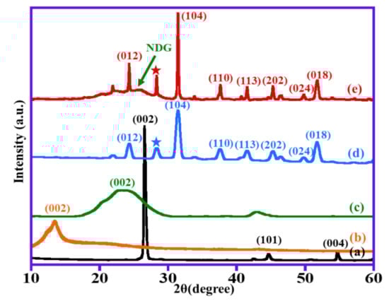 XRD analysis of (a) graphite, (b) GO, (c) NDG, (d) un-doped (1%) ZnO–MnCO3 catalyst, and (e) (1%)ZnO–MnCO3/(1%-NDG) samples.