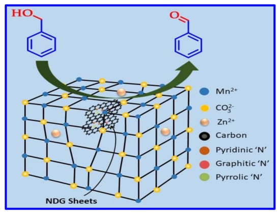 Doping of nitrogen has been utilized to fine-tune the structural and electrical properties of graphene, which in-turn leads to significant change of various properties of carbonic materials. Doping creates defects on the surface of the material which offer active anchoring sites to enhance the electronic density and dispersion of catalytically active metal NPs, therefore, this modification will make carbonic materials beneficial in several disciplines [30,31]. The additional N atom on the graphene nano-layer strongly effects the growth-mechanism of NPs, controls the morphology and size of the NPs, as well as assists the uniform dispersion of nanoparticles [32]. In addition, high electro-negativity of N atom also leads to the formation of catalytically active sites, owing to which NDG-based nanocomposites have also been widely utilized as heterogeneous catalysts for plenty of organic transformations [33,34]. Apart from agglomeration of metallic nanoparticles, the inevitable aggregation of graphene nano-layers causes a decrease in its surface areas [32]. Usually, the restacking of graphene nanosheets is prohibited by the inclusion of metals or metal oxides NPs like Pt, Ag, Co3O4, and CeO2 on the graphene layer [32,35,36,37]. Indeed, theoretical and experimental studies confirmed the benefits of metals or metal oxides/NDG composites for various catalytic transformations including oxidation of alcohol [38].