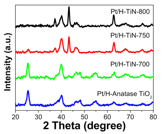 After the deposition of colloidal Pt nanoparticles on either H-anatase TiO2 or H-TiN supports, the crystalline properties of the Pt-deposited catalysts were also investigated. As shown in Figure 4, Pt/H-anatase TiO2 showed diffraction peaks related to its anatase phase, which are identical to the peaks observed in the H-anatase TiO2 support in Figure 2. In addition, distinct peaks related to fcc Pt were observed at 2θ = 39.7°, 46.2° and 67.4°, attributed to the Pt (111), Pt (200), and Pt (220) planes, respectively. Pt/TiN-700 also exhibited identical diffraction peaks for both anatase TiO2 and TiN, compared with the mother TiN support and it had distinct peaks related to Pt nanoparticles. The Pt/TiN-750 and Pt/TiN-800 samples also exhibited similar trends. The average crystallite size of the supported Pt particles was estimated using the Scherrer equation based on the Pt (220) diffraction peaks since the Pt (220) peak was isolated from the other peaks [5]. The estimated Pt particle sizes in Pt/H-anatase TiO2, Pt/H-TiN-700, Pt/H-TiN-750, and Pt/H-TiN-800 were 2.7, 2.7, 2.8, and 2.7 nm, respectively. In addition, the surface areas of Pt were calculated from the crystallite size obtained by the Scherrer equation using the following equation: