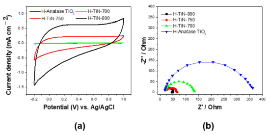 The electrochemical properties were further confirmed using the EIS results, as shown in Figure 5b. The EIS Nyquist plots of all samples exhibited typical semi-circular shapes. It is generally accepted that an EIS Nyquist plot with a small radius indicates a low resistance and good conductance. The smaller arc indicates low charge transfer impedance at the electrode-electrolyte interface. Of the four samples employed as catalyst supports in this work, H-TiN-800 exhibited the smallest arc radius, suggesting that it has the best conductive characteristics. As shown in Figure 4, H-TiN-800 has the highest TiN crystallinity and must have the most conductive TiN framework. Thus, it has the smallest arc among the samples employed. The relative arc size is in the order: H-anatase TiO2 > H-TiN-700 > H-TiN-750 >H-TiN-800. It indicates that the relative conductivity increases in the order: H-anatase TiO2 < H-TiN-700 < H-TiN-750 < H-TiN-800. This trend was consistent with the CV measurements. The improved electrochemical performance can be attributed to the intrinsic electronic properties of the TiN samples, such as their low electronic resistance. It is well known that TiN can offer an electronically conducting framework and allow fast charge transfer, inducing rapid electrochemical redox reactions. Furthermore, the TiN structure displayed better capacitance than its TiO2 counterpart [38]. In this work, we synthesized hollow anatase TiO2 and converted it to hollow TiN by ammonia nitridation at different temperatures. As the nitridation temperature increased, the TiN crystallinity of the resulting H-TiN sample was enhanced. Thus, the electrochemical properties of the resulting TiN samples can be significantly improved, which is desirable in electrochemical devices.