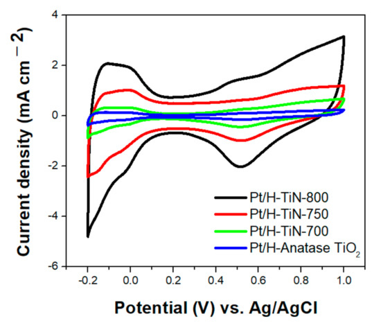 The electrochemical active surface area (ECAS) and electrochemical characteristics of both the Pt/H-anatase-TiO2 and Pt/H-TiN catalysts were investigated. Figure 6 shows the CV curves of the prepared Pt catalysts in an acidic electrolyte (0.5 M H2SO4), which were used to estimate the ECAS using the Coulombic charge for H+ ion adsorption–desorption. The CV curves of the Pt/H-TiN catalysts showed a typical H+ ion adsorption/desorption region, a double-layer charging region, a Pt pre-oxidation region, and a Pt reduction region. The peak area for the H+ ion desorption current was used to estimate the ECAS values, which were calculated from the integrated charge after correction for the contribution of the double-layer charging current using the following equation: