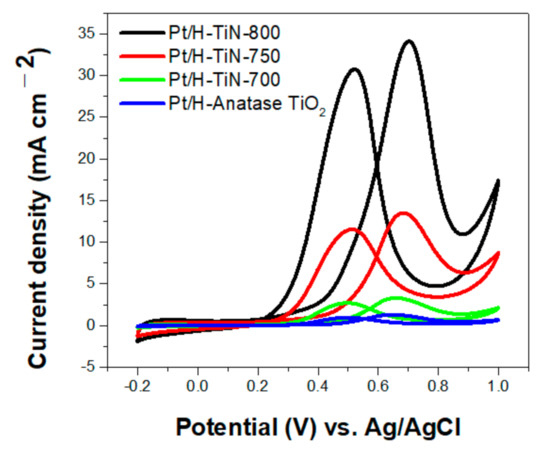 To evaluate the electrocatalytic activity of the prepared Pt catalysts, CV was performed in a H2SO4 solution in the presence of a methanol solution. Figure 7 shows the CVs of the prepared Pt catalysts in a 0.5 M H2SO4 electrolyte containing 2 M CH3OH. The methanol electro-oxidation current changed negligibly between −0.2 and 0.2 V. The current dramatically increased after 0.2 V, and the maximum peak current was observed at approximately 0.68–0.7 V. After 0.7 V, the current decreased since the number of Pt active sites was reduced owing to the formation of the Pt oxide surface. Above 0.85 V, the current increased again, indicating that methanol oxidation proceeded on the Pt-oxide surface. In the cathodic cycle, the active sites were recovered, resulting in the appearance of a methanol oxidation current peak. We evaluated the catalytic activity of the prepared Pt catalysts by comparing the maximum peak currents during the anodic scan. The relative maximum peak current density was in the order: Pt/H-anatase TiO2 < Pt/H-TiN-700 < Pt/H-TiN-750 < Pt/H-TiN-800. It should be noted that Pt/H-TiN-800 had the highest current density among the Pt catalysts employed in this study. This indicates that Pt/H-TiN-800 had the highest catalytic activity for methanol electro-oxidation.