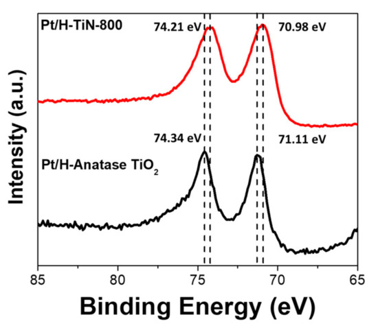 In addition, the electron that is not involved in the formation of covalent bonds creates electron-abundant environments in TiN. This can be transferred to the supported Pt nanoparticles and cause Pt to exist in a more reduced state. As shown in Figure 8, the Pt 4f XPS peaks of Pt/H-TiN-800 showed more negative values of binding energy (70.98 and 74.21 eV for Pt 4f7/2 and Pt 4f5/2, respectively) than those of Pt/H-anatase TiO2 (71.11 and 74.34 eV for Pt 4f7/2 and Pt 4f5/2, respectively). This indicates that Pt/H-TiN-800 has a more active metallic Pt surface than Pt/H-anatase TiO2. Because methanol electro-oxidation occurs easily on the surface of metallic Pt, Pt/H-TiN-800 exhibits outstanding activity.