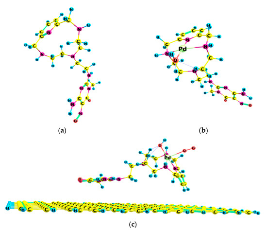 Molecular structures for the ORR catalyst: (a) HL1 (b); HL1-Pd(II)-OH− complex; (c) Cat1 final adduct C2D-HL1-Pd(II)-OH− with O2 interaction.