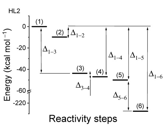 Potential energy surface (PES) for the elementary reactions yielding the composite catalyst: 1 to 5 (Cat2). Energy difference 6 corresponds to the catalyst/oxygen interaction, in the case of the HL2 supramolecular catalyst, UHF PM6 level of theory (compare Table 1 and Results and Discussion section for the details). SCF energy of (1) (2) (3) , (4) , (5) , (6) . The energy level (1) represents the sum of the energies of the non-interacting species, while (6) represents the energy of the complete catalyst supermolecule. The energy of the molecule was calculated in the electronic triplet state. The energy levels of the six steps have been normalized to the energy of state (1), which corresponds to a 744.78 kcal mol−1 absolute value.