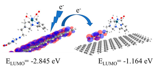 The energy ordering and shape of virtual orbitals for the HL1 moiety, Cat1, suggest that an electron “hopping” mechanism could explain the catalytic effect observed. Electrons can hop from the surface of the nanotube to the palladium complex to which the oxygen molecule is adsorbed, as can be seen in Figure 5.