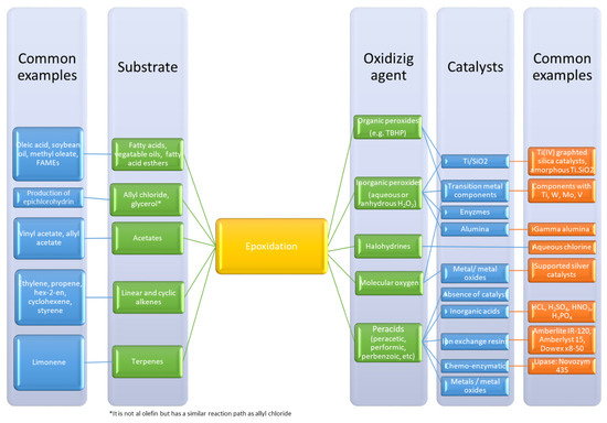 Three-membered rings are fascinating chemical functional groups because they represent an excellent compromise between stability and reactivity. The oxirane ring, consisting of two carbons and one oxygen atom, is the most representative of these three-membered rings. The synthesis of this ring is most often performed by the oxidation of unsaturated groups. Another name for this reaction is epoxidation. This reaction can be undertaken in gas, liquid or liquid–liquid systems, where a catalyst plays an important role. An overview of common epoxidation methods and routes are shown in Figure 1.