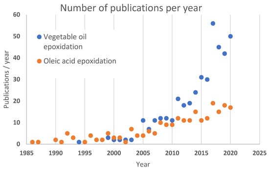 Even though epoxidation has been known for over 100 years, it has not been widely used for modification of vegetable oils until there became a market need for renewable building blocks. Before the 1990s, there was not much research related to epoxidation of vegetable oils, see Figure 4. The classical Prilezhaev epoxidation has been studied by different aspects in several groups since then.