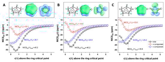 We next turned to the NLPE in the three heterocyclic anions. As shown by the isosurface of MOmin-σ(LP) at the top of Figure 1, the NLPE presented an obvious delocalization over the rings of N5¯, N4C1H1¯, and N3C2H2¯, and the delocalization region expanded when more nitrogen atoms were present in the ring. Interestingly, the delocalization of the NLPE spreads out over the interior and exterior of the ring (Figure S4 of the Supplementary Materials). In N4C1H1¯ and N3C2H2¯, the presence of the CH bonds destroys the NLPE delocalization in the exterior of the ring, but their delocalization in the interior of the ring is not much influenced. In N5¯, the NLPE delocalization fulfills both the interior and exterior of the ring. Correspondingly, the DImin-σ(LP) values of N5¯, N4C1H1¯, and N3C2H2¯ were all calculated to be 0.16, thereby confirming the NLPE delocalization at each minimum σ orbital. As shown at the bottom of Figure 1, the highest absolute value of the NICSzz(r)σ of N5¯ was rextreme = 0.6 Å vertically above the ring critical point, which is the same as the P2N3ˉ anion []; for N4C1H1¯, rextreme = 0.8 Å; for N3C2H2¯, rextreme shifted to 1.0 Å. As shown in Table 1, the values of NICSzz(1)σ and NICSzz(rextreme)σ were both negative, indicating the presence of an additional σ-aromaticity in the three heterocyclic anions; the order of their σ-aromaticity was N5¯ > N4C1H1¯ > N3C2H2¯. The contributions of the NLPE delocalization to σ-aromaticity was also discovered in the (NH)n (n = 3–6) systems [].