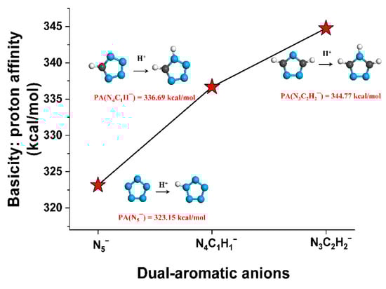 The PA defined by Equation (1) was employed to evaluate the basicity of the nitrogen heterocyclic anions studied; a higher PA corresponds to a stronger basicity. As shown in Figure 2, the value of the PA increased with the decrease in nitrogen atoms in the heterocyclic anion. Therefore, the sequence of their basicity was N5¯ < N4C1H1¯ < N3C2H2¯, which is consistent with the order obtained from experimental pH tests (pKb = 9.1 for N4C1H1¯ and pKb = 4.0 for N3C2H2¯) [,].